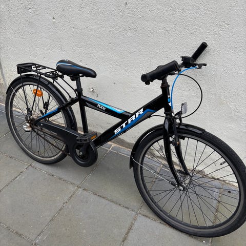 Børnecykel med 24" hjul i hvid farve. Cyklen har lav indstigning, kædeskærm, støtteben, bagagebærer og kurv foran. Udstyret med reflekser på hjul og pedaler samt håndtag med greb. Velegnet som hverdagscykel til barn i skolealderen. En del rust men fungerer fint. Min datter er ca 1.50m høj og den er ved at være alt for lille