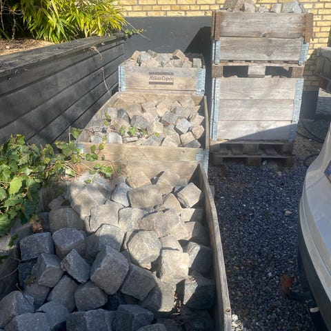 Brosten i granit, overvejende grå nuancer. Stenene fremstår som massive, tilhugne blokke egnet til belægning. Velegnet til fx indkørsler, stier, kanter eller andre udendørs belægningsopgaver, hvor der ønskes en robust og naturpræget overflade. Størrelserne varierer fra sten til sten, men ligger inden for almindelige mål for brosten i granit. pr. Stk. 10 kr