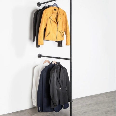 RackBuddy tøjstativ med 6 hylder og 3 bøjlestænger, perfekt til ungdomsværelse, soveværelse eller bryggers. De 2 tophylder er 125 cm bredde, de øvrige 4 hylder er 115 cm bredde. Kan monteres uden at fastgøre i gulvet via de 3 fæstninger i væggen. Serie: The Original. Rørfarve: Silver. Trætype: Dark Oak. Købt i 2022 til nypris 6.000,-. Kvittering haves.