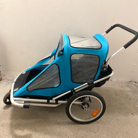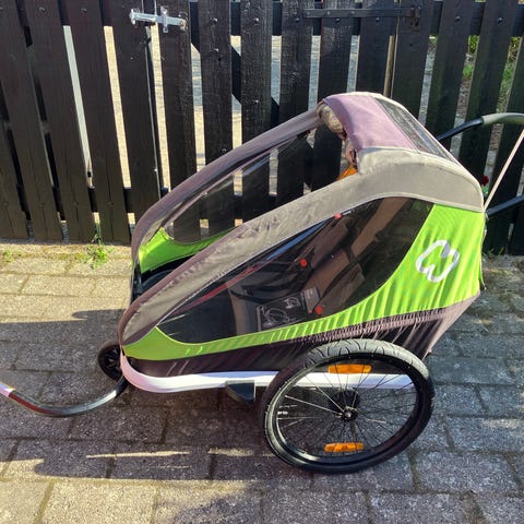 Cykelanhænger til børn i gul og grå med gennemsigtigt frontvindue og net. Anhængeren har plads til to børn og er udstyret med indvendige seler til fastspænding. Den har to hjul med reflekser samt metalstel og trækstang til montering på cykel. Toppen kan åbnes med lynlås, og der er sikkerhedsflag monteret bagpå for bedre synlighed i trafikken.
