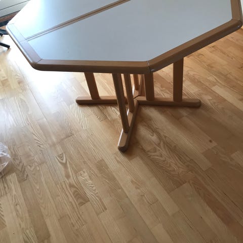 Rundt spisebord med buede ben i samme træ. Velegnet som mindre spisebord eller sofabord i køkken, stue eller spisekrog. Pris 150 kr per stk, 250 kr for begge.