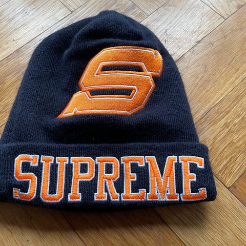 Supreme hue i sort farve, one size. Huen har stort broderet S på fronten og Supreme-logo på opsmøget. Materialet er blød og behagelig. One size-passformen gør, at huen typisk passer de fleste voksne.