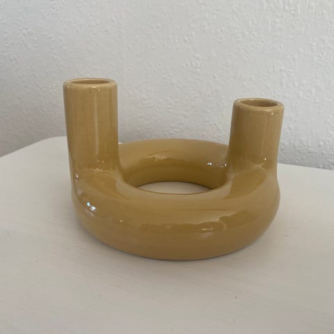 Sød, cremefarvet lysestage i keramik med riller og hanke. Kan både bruges til fyrfadslys og kertelys :)