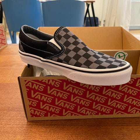 Stort set ubrugte Vans Old Skool. Nypris: 750,-Virkelig lækker kvalitet: mørkeblåt (navy) lærred og ruskind, ekstra polstring i hælen og den karakteristiske hvide stribe. Desværre voksede knægten ud af dem aaalt for hurtigt, så de er nærmest som nye (jeg kan i hvert fald ikke se noget slid).