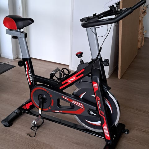 HMS Sport motionscykel i sort. Cyklen har justerbar modstand via drejeknap og et display med knapperne Set, Mode og Reset til indstilling og visning af træningsdata. Egnet til indendørs konditionstræning og motion i hjemmet. Cyklen har pedaler med stropper og stabil bundramme.