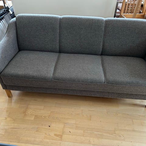 Flot og velholdt sofa med god siddekomfort. Det mørke uldstof giver et stilrent look.