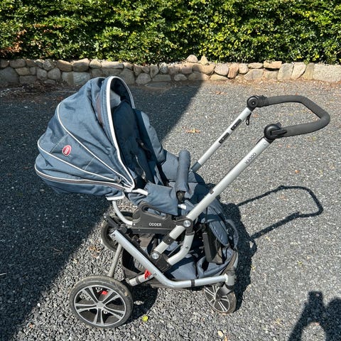 Mutsi iGo der har både barnevogn og klapvogn dele. Kan foldes helt sammen, hjul kan tages af. Kører skarpt om hjørner da begge forhjul drejer.