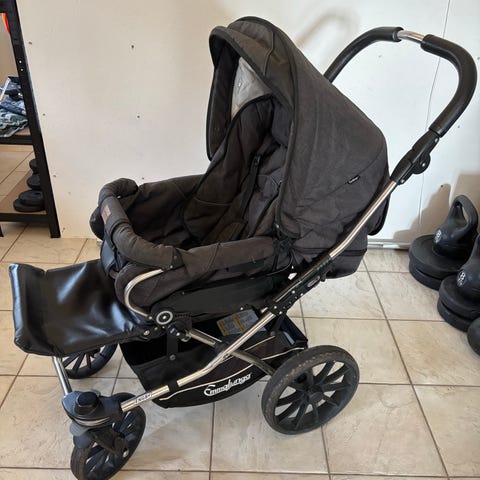 Emmaljunga klapvogn i sort tekstil med detaljer i kunstlæder på styr og bøjle. Vognen har justerbart styr, stor kaleche og polstret sæde med sele. Forhjulene er drejelige, og baghjulene er større med mønster til kørsel på forskellige underlag. Under sædet er der opbevaringskurv. Der medfølger søskendebræt, som kan monteres på vognen, så et større barn kan stå eller sidde under kørsel.