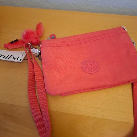 Lækker silkeagtig håndtaske fra Kipling med flotte detaljer, justerbar skulderrem og klaplukning med trykknap. Skrå lynlåslomme på forsiden og inden i 2 lynlåslommer samt to små stiklommer. Har en flot satin-finish og en svag rosa glød. Rem til crossover men kan også bruges som clutch uden remmen. Måler ca 26x17 cm