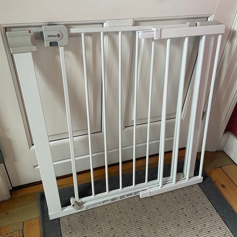 Hauck sikkerhedsgitter i sort metal. Gitteret består af flere sektioner med låge i midten, der kan åbnes. Det egner sig til afskærmning af områder i hjemmet, f.eks. omkring pejse eller døråbninger. På billederne ses mål med tommestok, som kan bruges til at vurdere længde og opstilling i rummet.