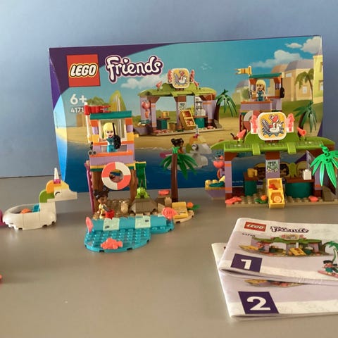 LEGO Friends Skildpadderedningsmission, lille ø med skildpadder og åben bil. Sættet indeholder en strandhytte på pæle med trappe, veranda og tilbehør som redningskrans og surfbræt. Der medfølger en minidukkefigur samt flere små dyrefigurer. Sættet kan bruges til rolleleg omkring strandliv, kørsel i bil og pasning af havdyr. Velegnet til børn fra 6 år og opefter ifølge æsken.