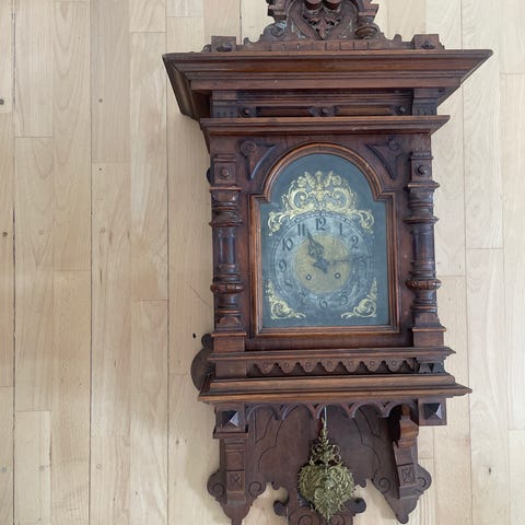 Kvadratisk vægur med front i trælook og metaldekoration nederst med ornamenteret mønster. Uret har hvide romertal og visere på den øverste del af fronten. Bagsiden har batteridrevet urværk med ophæng, så uret kan hænges på væggen. Velegnet som dekorativt vægur i fx stue, køkken eller entré.Uret er 23x27 cm.