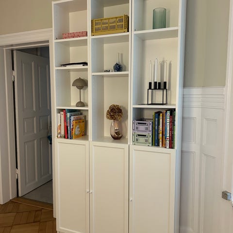 Lys træ (BILLY) med hvidt vitrineskab i midten
