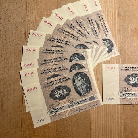 30 x 20 kroner seddel 1972. 2 brugt ellers ubrugt. 12 x 10 kroner sedler. 1 brugt. 2 x 100 kroner. Brugte. Afhentning Odense.