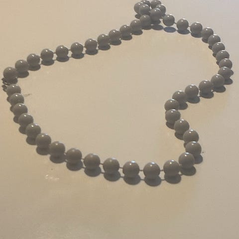 Halskæden består af runde perler i lys farve med marmoreret mønster.