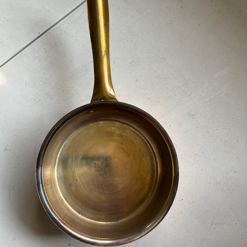 Klassisk norsk kasserolle i kraftig kvalitet på 780 gram. Udført i kobber med inderside af rustfrit stål. Den måler 7 cm. i højden og ca. 15 cm. i diameter. Flot stand, dog med en lille kosmetisk bule indvendigt i siden uden betydning for brug.