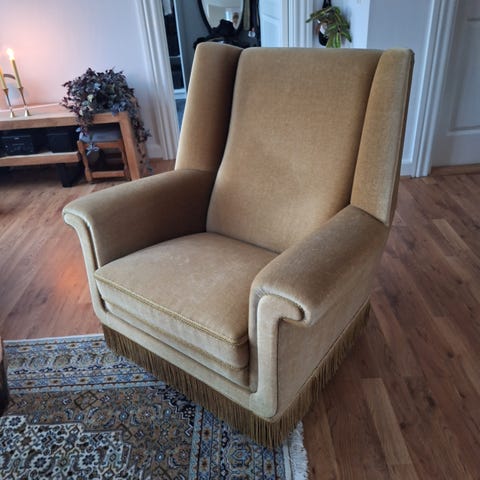 Flot vintage loungestol med elegante, udskårne armlæn og tidstypisk design fra overgangen mellem art deco og dansk modernisme. Stolen er solidt opbygget med gjord og fjedre, hvilket giver god komfort og holdbarhed.
