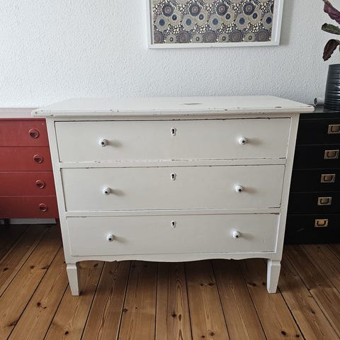 Kommoden er i fin stand med bærer præg af flere års brug. Den har navnligt en lille slidskade på kanten af øverste skuffe, som jeg også har tilføjet et billede af.
