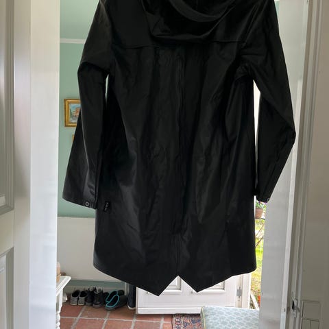 Næsten i brugt rains jakke. Lynlås dyt er dog i stykker. Jeg har sat en ring så den kan lukkes.