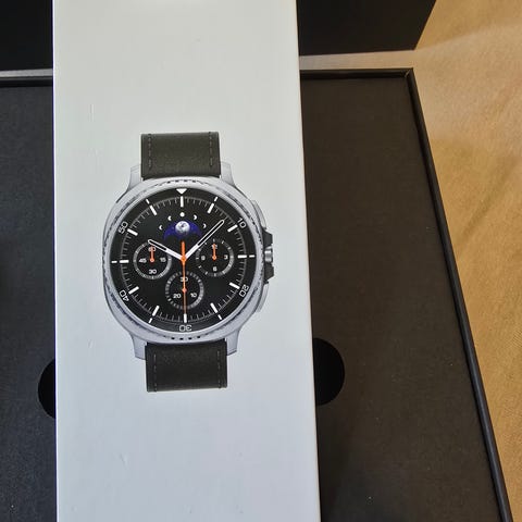Smartwatch med rund urskive og hvid silikonerem. Uret har touchskærm og sensorer på bagsiden til aktivitets- og pulsmåling. Medfølgende magnetisk oplader med USB‑tilslutning. Velegnet som hverdagsur og til træning for både mænd og kvinder.