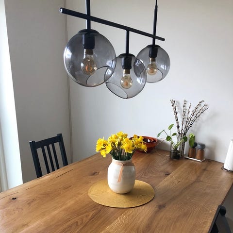 Pendel med fire runde glasskærme i røgfarvet glas med bølgemønster, der vender i hver sin retning. Metalstel i mat sort og med 3m sort stofledning.