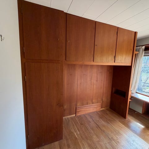 1 stk. åben reol af Boligens Byggeskabe sælges. Den er gjort i grålakeret dyrolit med ramme i oregon pine. Der medfølger 4 originale hylder.