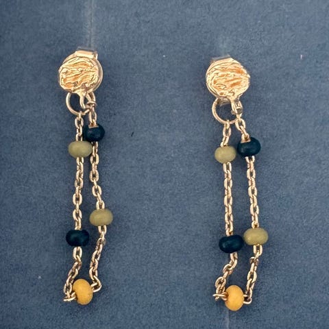 Øreringe: Helt nye Astrid Hoops i farven Rainbow. De er lavet af 18 karat forgyldt sterlingsølv og er kendetegnet ved deres håndlavede overflade og små, farverige emaljekugler, der hænger som vedhæng.