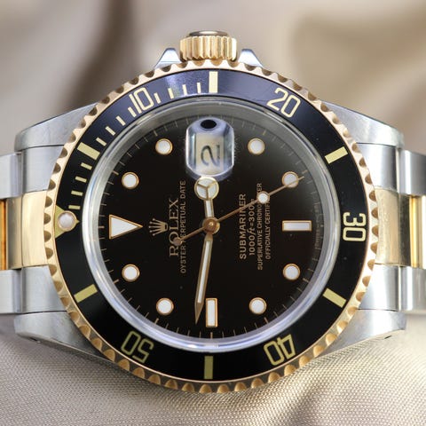 Klassisk Rolex Submariner i guld og stål med sort skive og matchende sort lynette. En ikonisk two-tone model, som har opnået stor popularitet blandt samlere.