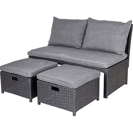 Cypern 5-delt loungesæt i sort er et flot loungesæt som indeholder 2 skamler, 2 hjørnemoduler og 1 sidebord. Loungesættet kan stilles på forskellige måder bl.a. ved at kombinere hjørnemodulerne sammen med de to skamler og stille sidebordet i midten. Til loungesættet følger et fuldt sæt hynder med som øger komforten. Sættet passer perfekt ind på terrassen eller i hyggekrogen. Loungesættet er lavet af galvaniseret stål og polyrattanflet og det lille bord har glasplade.