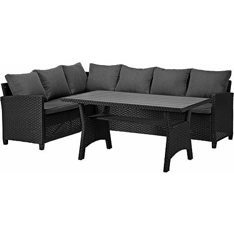 Kreta loungesæt i sort farve består af 3 dele - 2 personers loungedel, chaiselong, et bord og et fuldt sæt hynder. Chaiselongen kan vendes til både højre og venstre derudover passer loungesættet perfekt ind på terrassen. Loungesættet er lavet af polyrattan og stål med hynder i polyester.