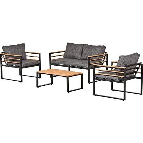 Sættet er fremstillet i plastik, hvilket gør det både robust og vejrbestandigt. Det kræver minimal vedligeholdelse - rengør blot med vand og sæbe efter behov. For at forlænge loungesættets levetid anbefales det, at det opbevares i tørvejr udenfor sæsonen, hvis det er muligt.