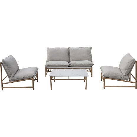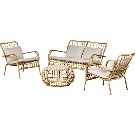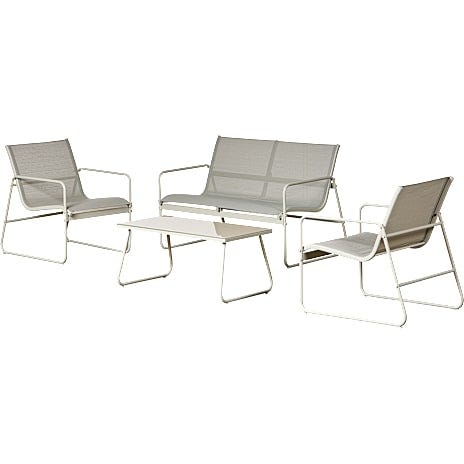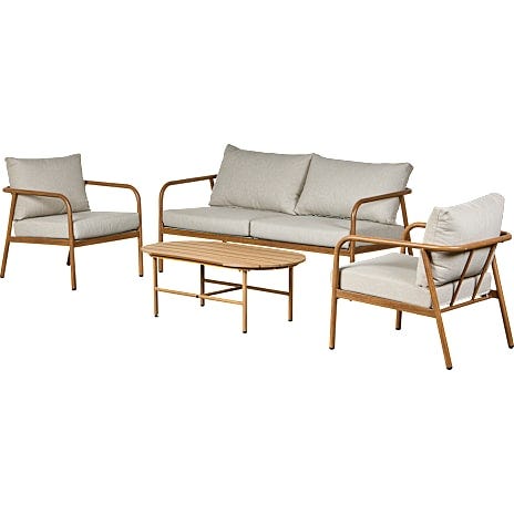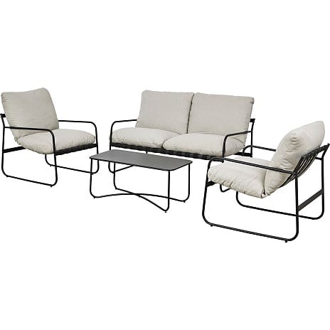 Loungesættet har et moderne og let udtryk med bløde former og stribede hynder. Sættet består af en sofa, to loungestole og et lavt bord, der tilsammen skaber en afslappet og indbydende atmosfære.