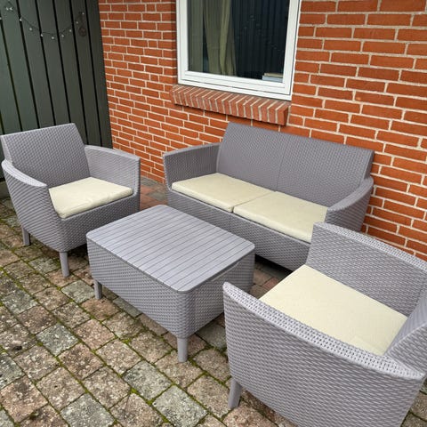 Sættet besår af 1 bord, 1 sofa og 2 stole,