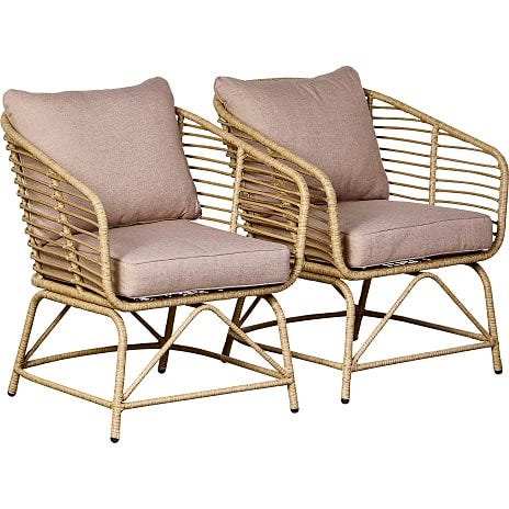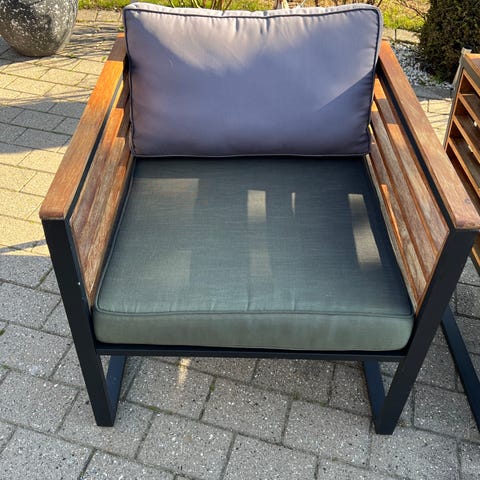 Sættet består af en lav loungestol med tilhørende fodskammel. Begge dele har lys polstring og stel i stål. Velegnet til afslapning på terrasse eller altan.