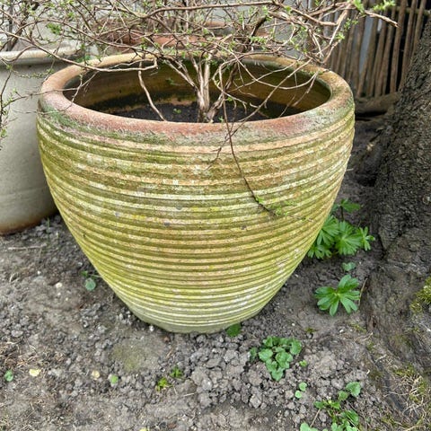 Højde 15cm, bredde 30cm, bredde øverste kant 19cm. Krukken er tung.