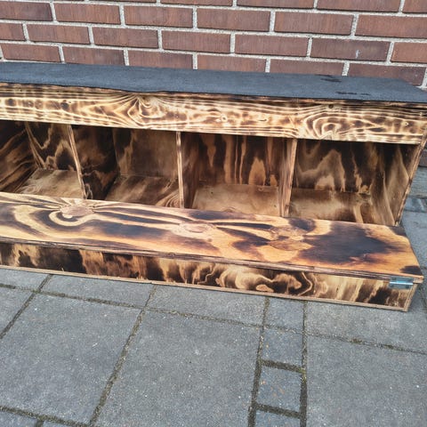 Det fungere ikke så godt i mit alt for lille hønsehus. Smarte redekasser hvor æggene ruller ned i et rum. Medfølger nogle græsmåtter jeg har købt :)