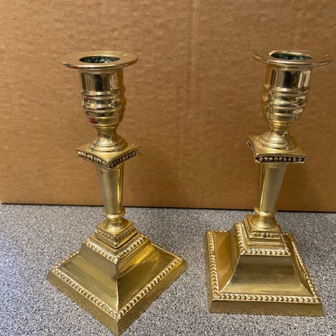 Trearmede lysestager i messing. Klassiske, fritstående lysestager med plads til flere lys hver. Velegnet som borddekoration eller til brug på hylder og vindueskarme i hjemmet.