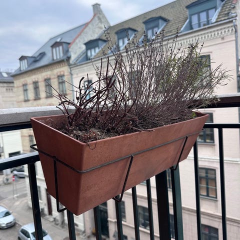 Altan plantekasse i sort fletmateriale. Kassen er aflang og monteres på altanrækværk med justerbare remme, som ses på billederne. Velegnet til beplantning eller opbevaring på altan eller balkon. Mål fremgår af foto med tommestok (ca.-længde kan aflæses der). Materialet er let og perforeret, så overskydende vand kan løbe fra.
