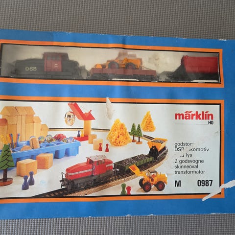 Märklin 0987 modeltog startsæt bestående af modeltog, skinner og tilbehør. Sættet indeholder blandt andet lokomotiv, godsvogne, lige og buede skinner samt transformer til styring af toget. Der medfølger desuden ekstra lokomotiv og vogne, flere transformere samt diverse huse, bygninger, træer og andet landskabstilbehør til opbygning af en modeljernbane. Velegnet til opbygning af et komplet Märklin modeltogsanlæg med togdrift og bymiljø.
