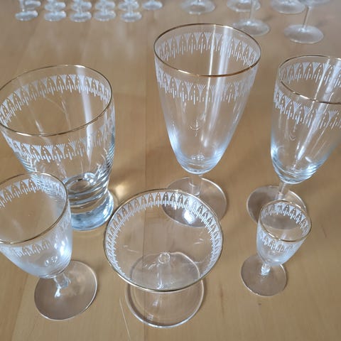 Alle glas fremstår i rigtig flot stand uden skår eller revner. Guldkanten er velbevaret. Max. Brugt 5 gange, kun opvask i hånd.