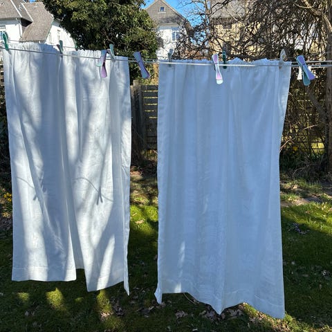 8 styks tynde fine gardiner syet i ostelærred. Der er rynkebånd i alle. De måler 65 x 65 cm. Har også et sæt gardiner i højde 116 cm, bredde 86 cm- også med rynkebånd.