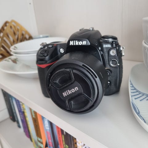 Nikon digitalt spejlreflekskamera med tilhørende Nikon DX zoomobjektiver og ekstern blitz. Sættet omfatter kamerahus, flere udskiftelige objektiver med variabel brændvidde samt en dedikeret blitz til montering i kameraets hotshoe. Udstyret er egnet til generel fotooptagelse, herunder portrætter, rejser og hverdagsfotografering, hvor der er behov for fleksibilitet i brændvidde og ekstra lys fra ekstern blitz.