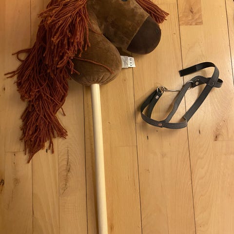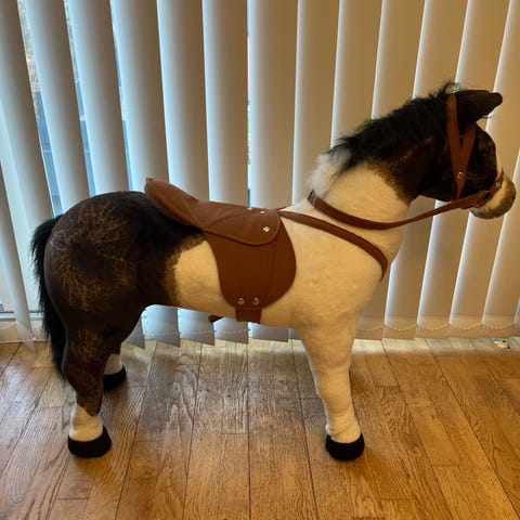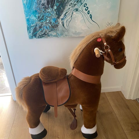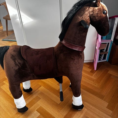 Brun hestebamse med lyd. Sælges med saddel og hovedtøj.