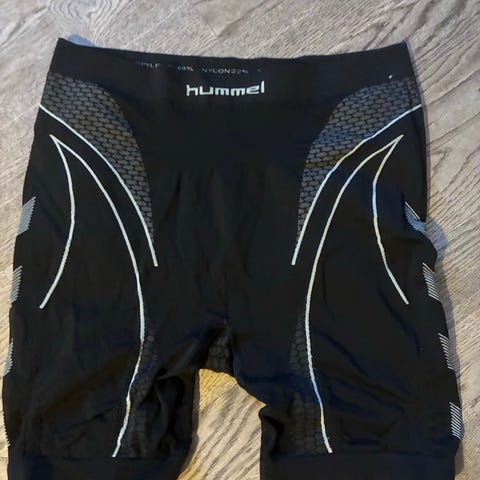 Lækre bløde Hummel træningsshorts / træningsbukser - se materialer på fotos. Meget stretch. Hummel træningsshorts til fitness. Shortsene er i damestørrelse M /L og er fremstillet i et strækbart materiale med hovedsageligt nylon og elastan, som giver god bevægelsesfrihed. Modellen er sort med Hummels karakteristiske vinkler i kontrastfarve i siderne. Elastisk linning uden snøre. Velegnet til fitness, træning og anden sport, hvor der ønskes tætsiddende og fleksible shorts.