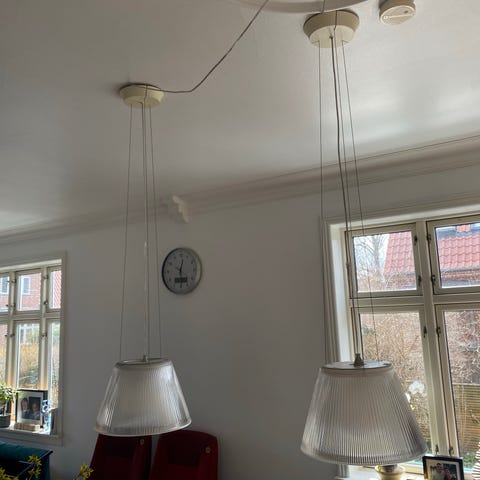 A pair of Kartell designer pendant lamps with a striking chrome-ribbed cylindrical shade and sculptural clear acrylic hardware. 350 dkk each or 600 dkk for both.