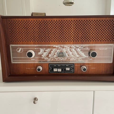 SMSL radio i træ kabinet. Enheden har frontgitter i metal, afrundet kabinet i træ og et analogt drejeskive-display med frekvensangivelse på fronten. Der er tre betjeningsknapper nederst på fronten til indstilling af lyd og kanaler. Designet er inspireret af klassiske bordradioer med lodret front og integreret højttalerbaggitter. Velegnet som bordradio eller som del af et lydanlæg i stue eller kontor.