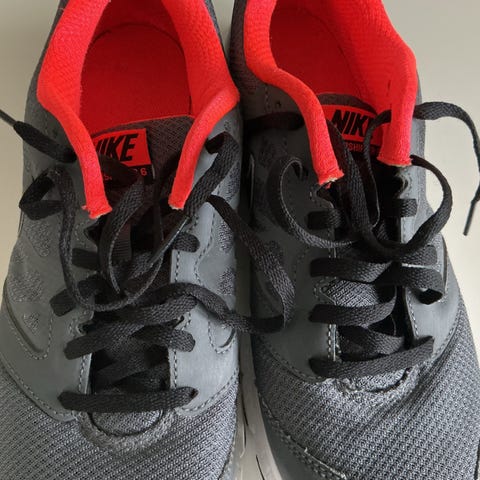 - Nike løbesko til løb i størrelse 42/42.5 Skoene er i en kombination af rød og sort med synlige støddæmpende elementer i sålen. Overdelen er i åndbart materiale, og modellen er egnet til løbetræning og anden sport, hvor der er behov for støtte og komfort til foden.