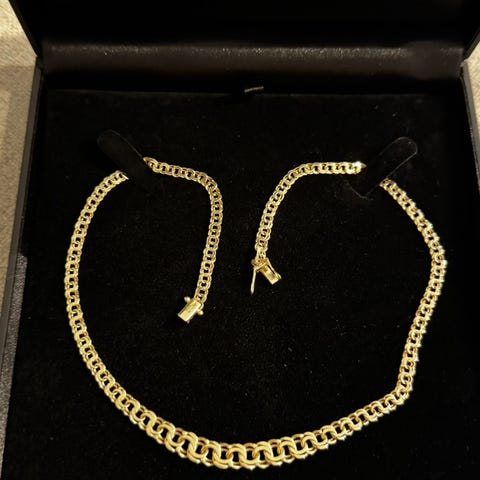 Materiale: 100% rustfrit stål, PVD-belagt med 18 karat guld. Nypris 270kr.
