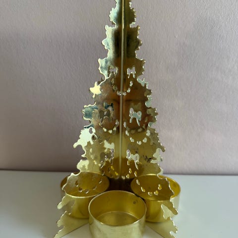 adventslysestage med glas til fyrfadslys i træbakke, måler 30 x 9 x 8 cm., brugt en gang