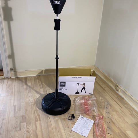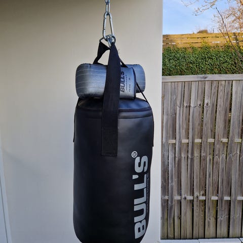 Everlast boksebold til træning. Boksebolden er i sort med gul top og har ophængsstropper i gråt materiale. Medfølgende metalbeslag til montering i loft samt to skruer til fastgørelse. Velegnet til boksetræning derhjemme eller i mindre træningsrum. Kan også ringes op udenfor under tag. Den har lidt pletter i top og bund men er ellers i god stand :)